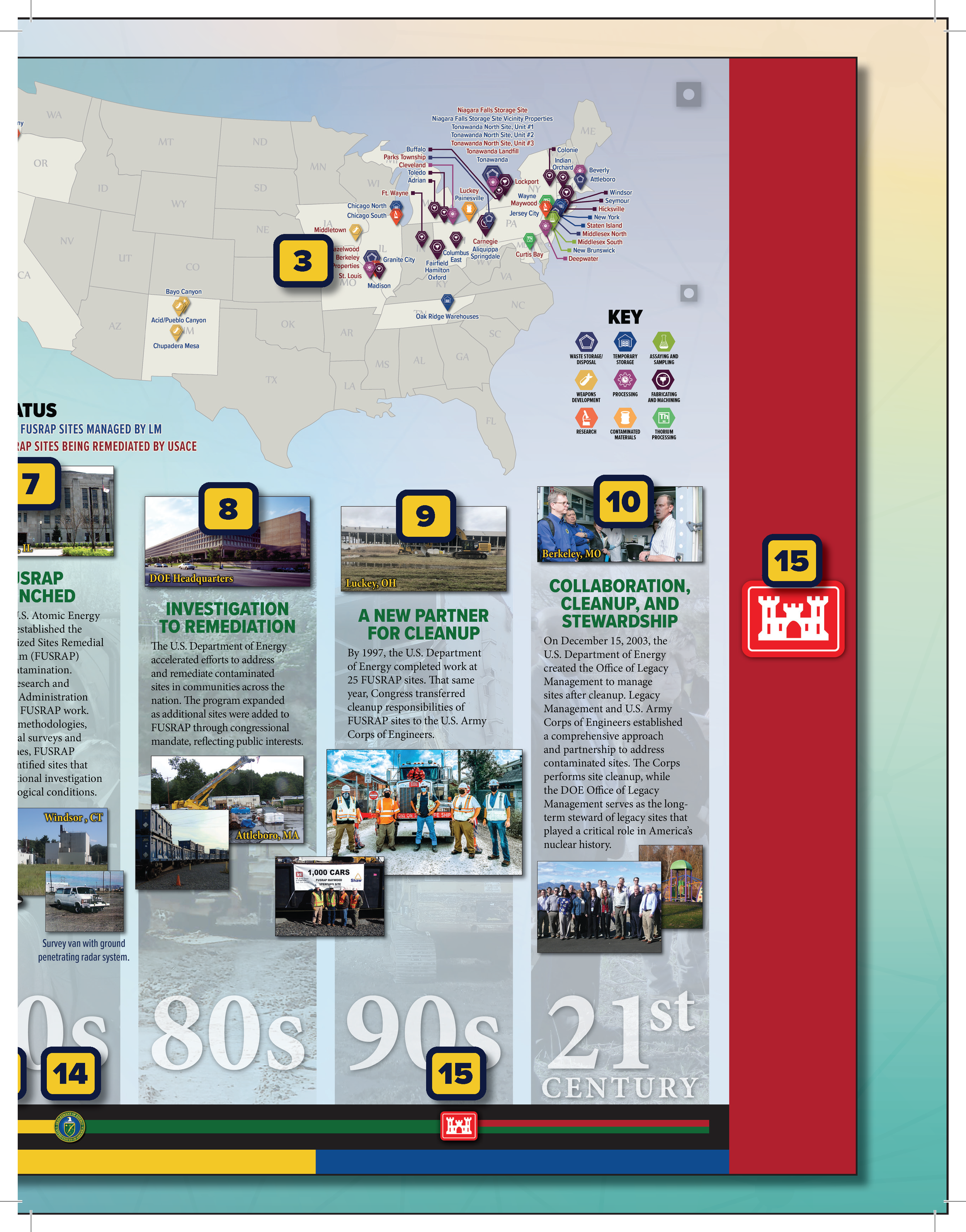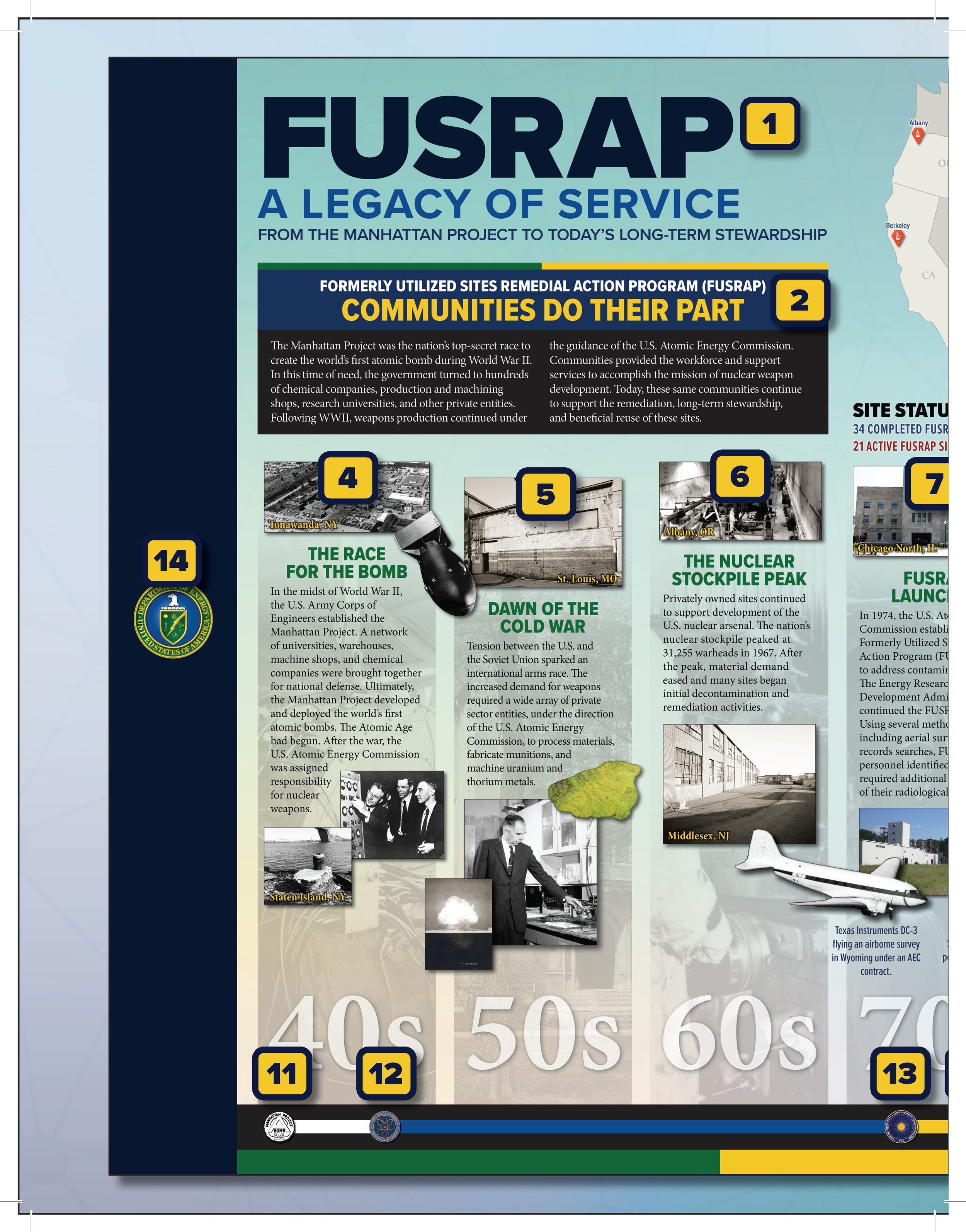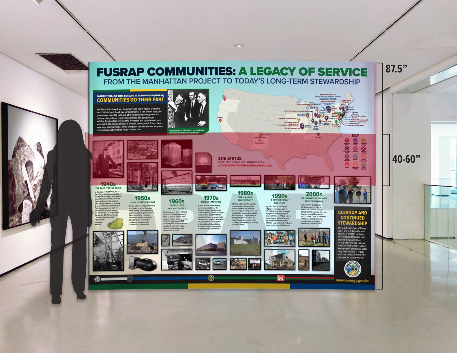 Designed a large traveling display and interactive website for a joint Legacy Management and U.S. Army Corps of Engineers project. Worked with a team that was matrixed between the two agencies to source assets, develop a cogent narrative, design and deploy multiple travelling displays, and create a first-in-agency interactive website for online stakeholder engagement. The original full sized display graces the halls of the Forrestal building in Washington, D.c.